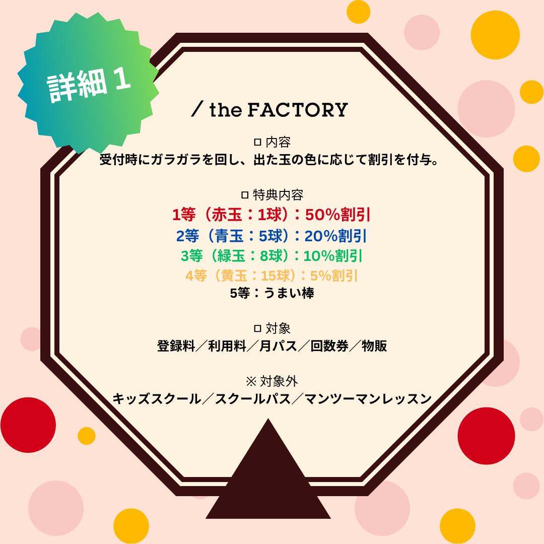 受付時にガラガラを回し、出た玉の色に応じた割引を提供する。